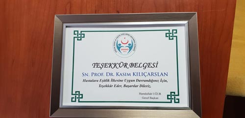 Ziyarette Hasta Hakları ve Uygulamaları konusunda işbirliği üzerinde duruldu. Hastalara eşit davrandığı için, Dernek Başkanı Hamdullah Uğur tarafından Prof. Dr.Kasım Kılıçarslan’a Teşekkür Belgesi takdim edildi.