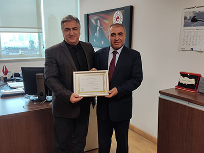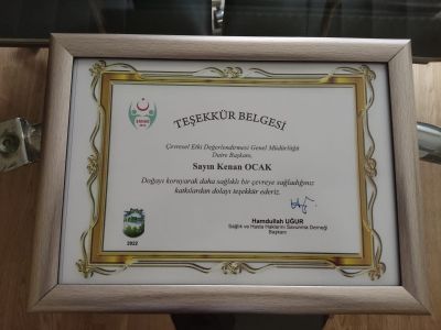 Çevresel Etki Değerlendirmesi Genel Müdürlüğü Daire Başkanı sayın Kenan Ocak'a çevreye ve sağlığa olan faydalarından dolayı Sağlık Hakkı ve Hasta Haklarını Savunma Derneği Başkanımız Hamdullah Uğur teşekkür belgesi takdim etti.
